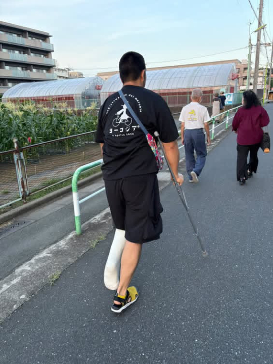 真夏に届いたヨーコジアTシャツの写真。松葉杖をついた後姿が痛々しすぎて速報に載せなかったのですが、完治したそうなのでお祝いにこちらで。